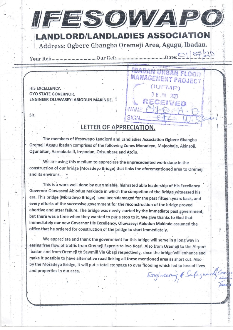 Image Ifesowapo Landlords Association in Ogbere Gbangba Oremeji Area, Agugu, Ibadan have have expressed their appreciaition for the construction of the Moradeo Bridge. Media Date 2020-07-01